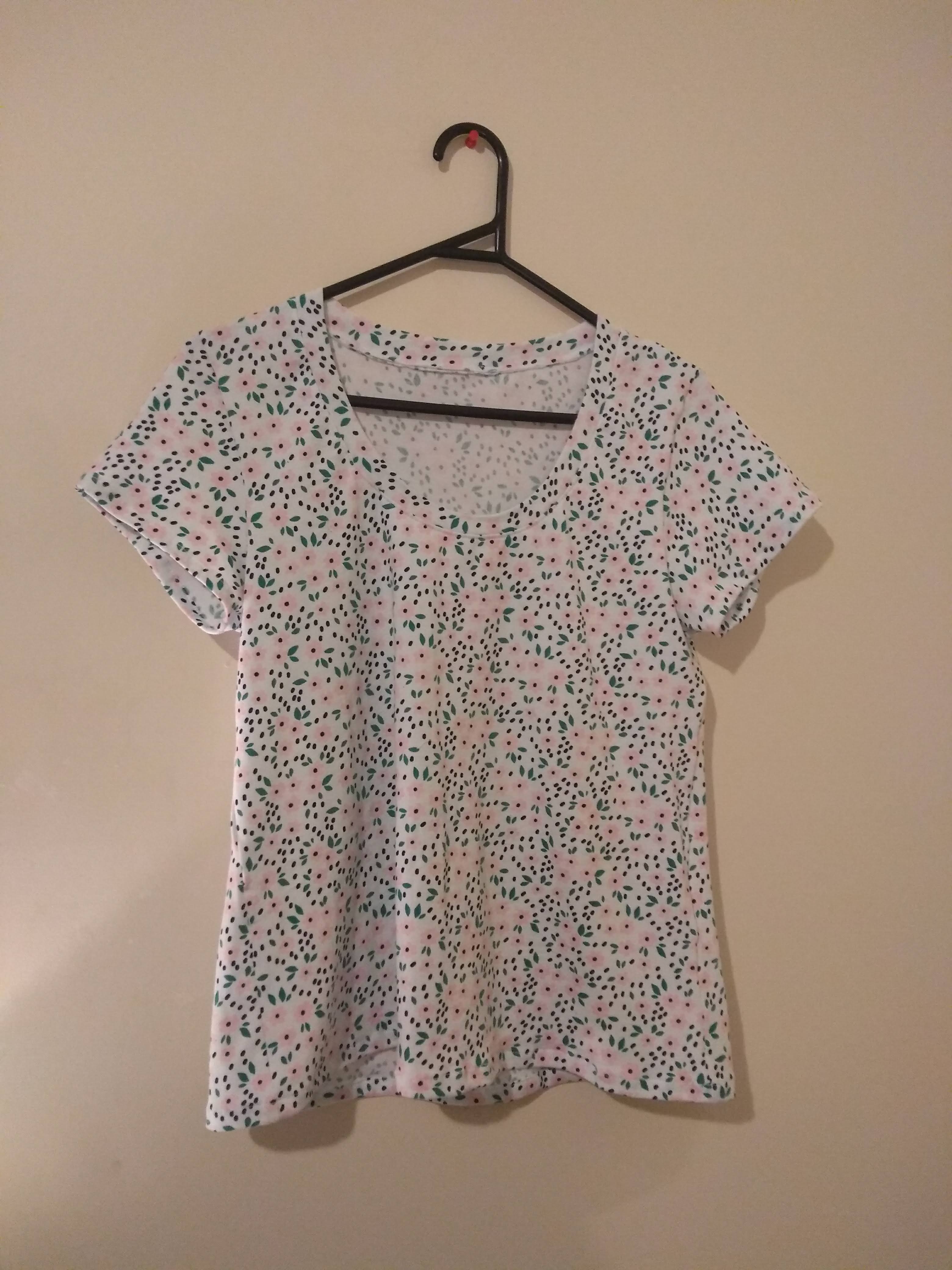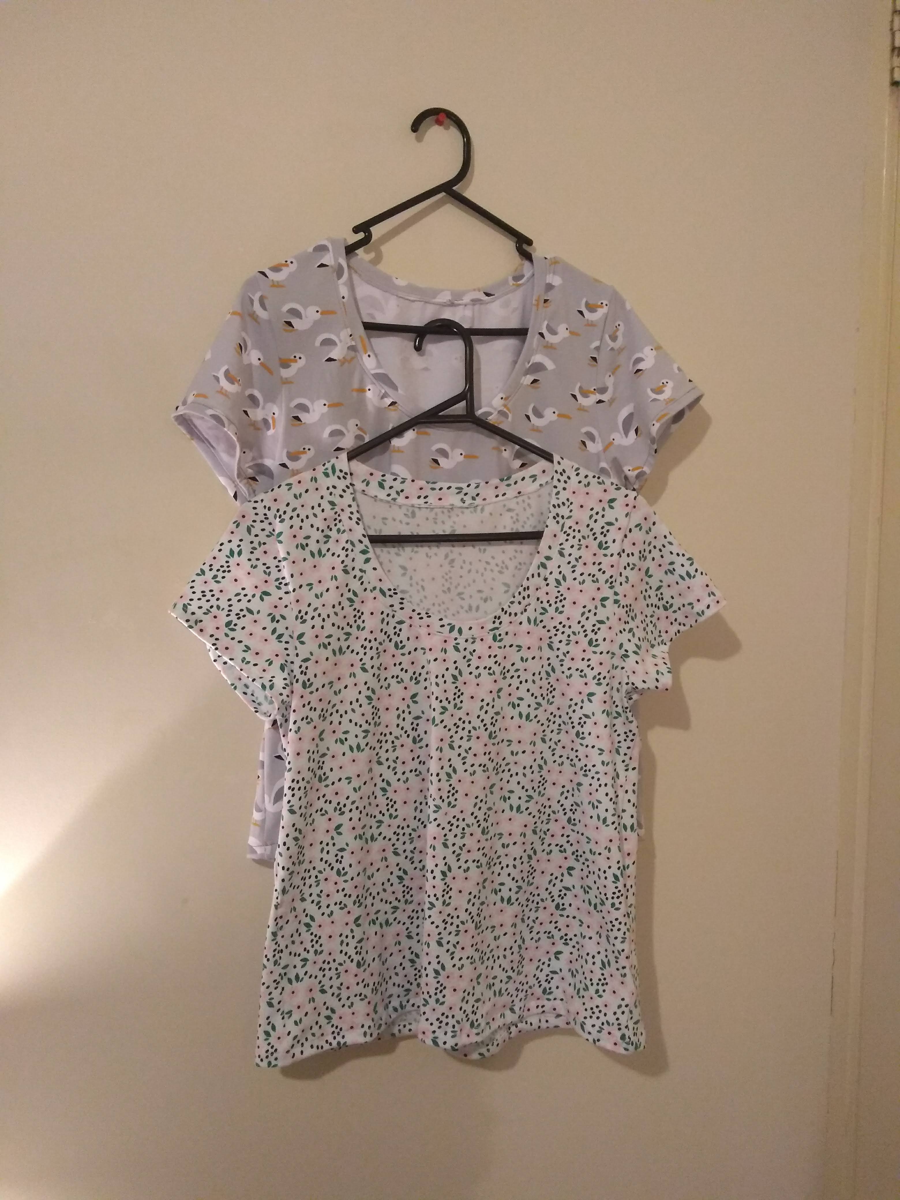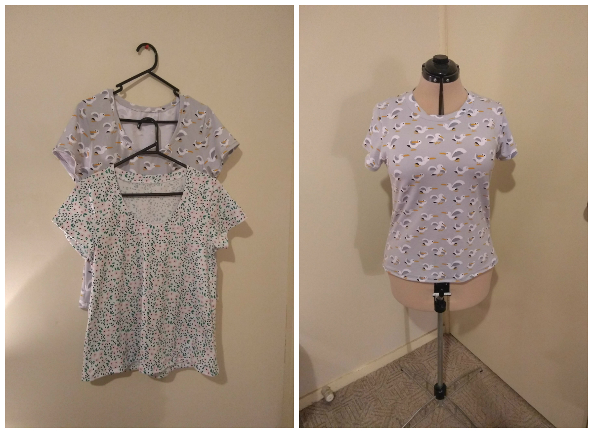 Two of the t-shirts were made in a grey seagull print cotton spandex, and the other was made in a white floral cotton spandex.