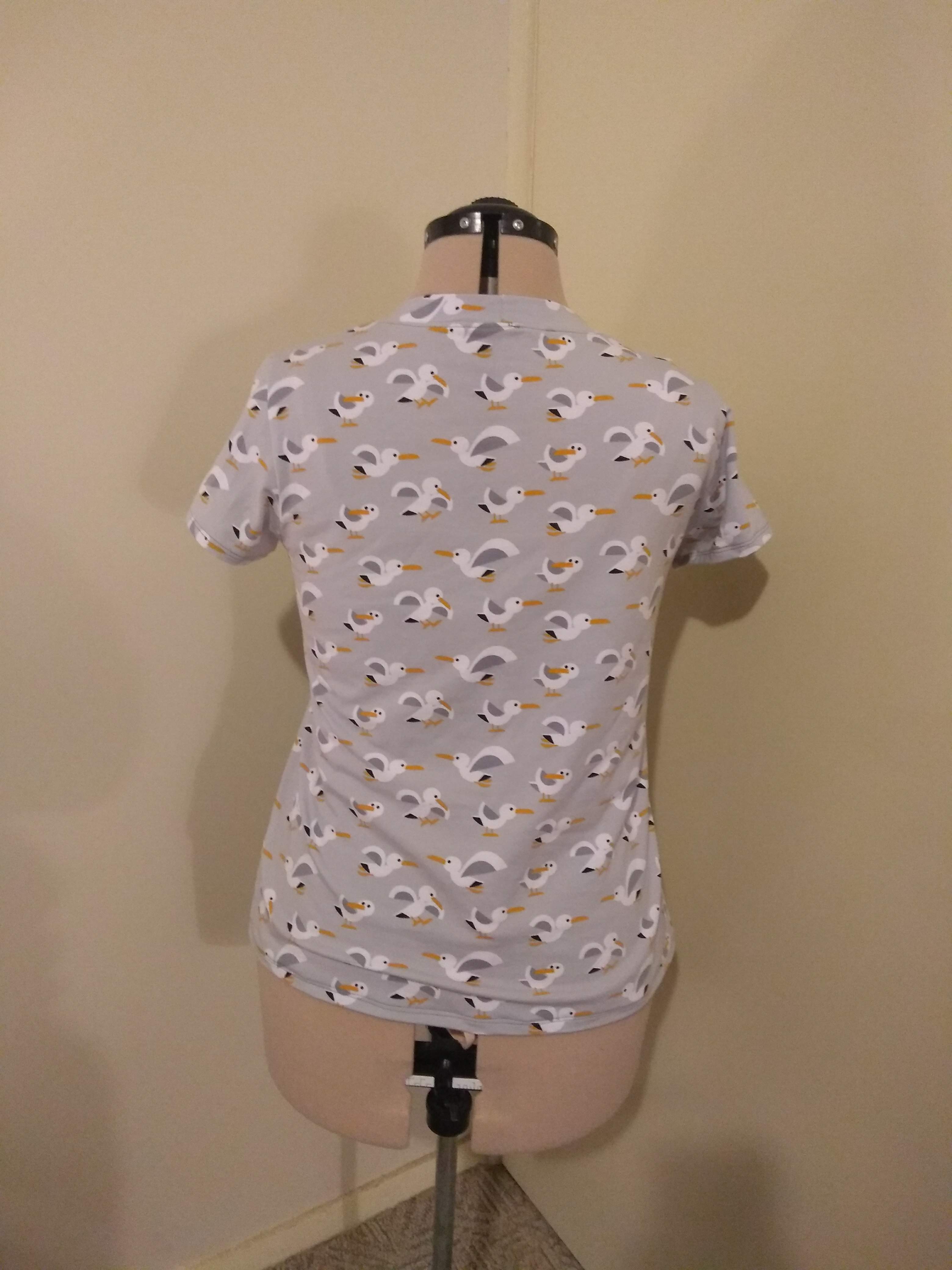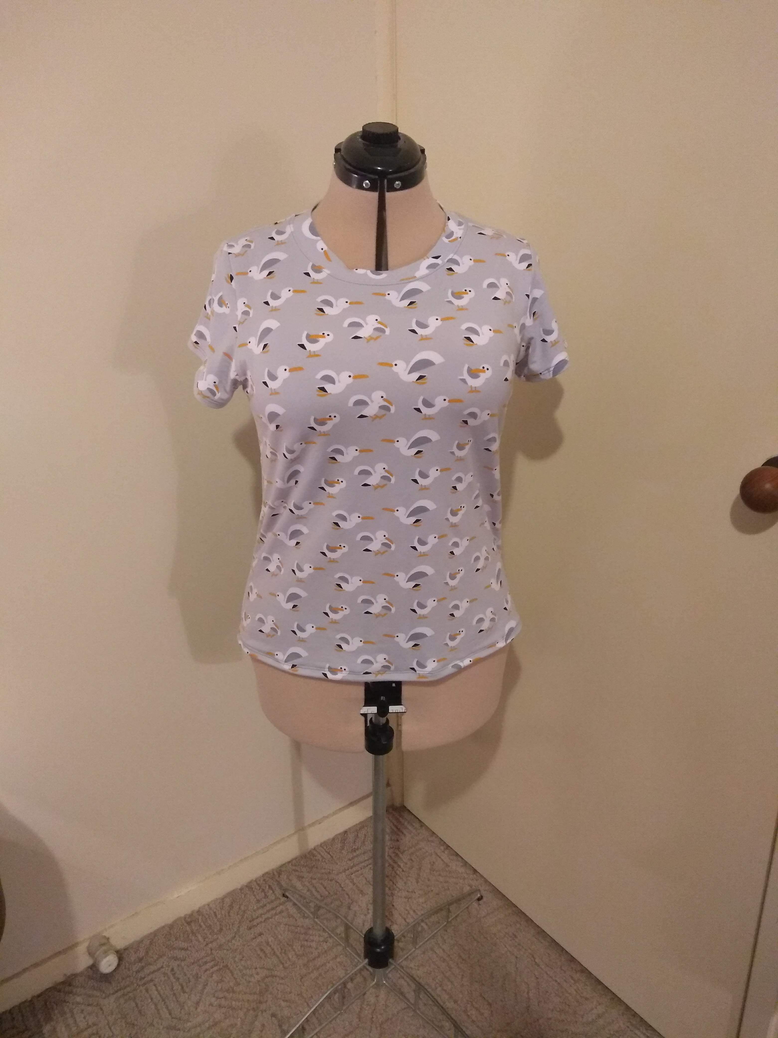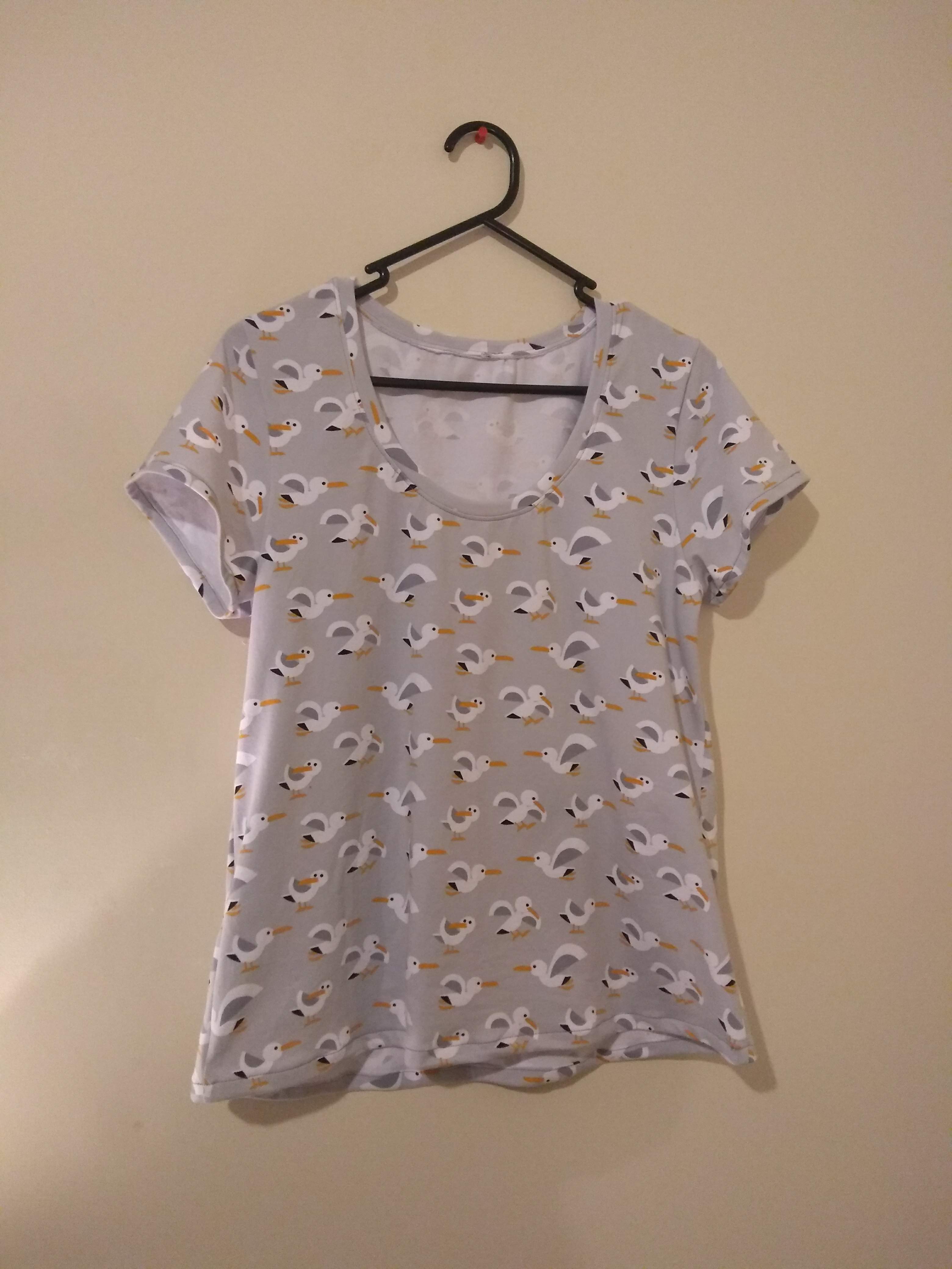 The first seagull t-shirt in the picture above was the one that I made for myself which has a higher neckline and thicker neckband than the original pattern. When cutting out the pattern pieces, I just raised the neckline by placing an existing t-shirt over the of the front piece and cutting it to approximately the same place. I increased the size of the neckband by doubling the width when cutting.