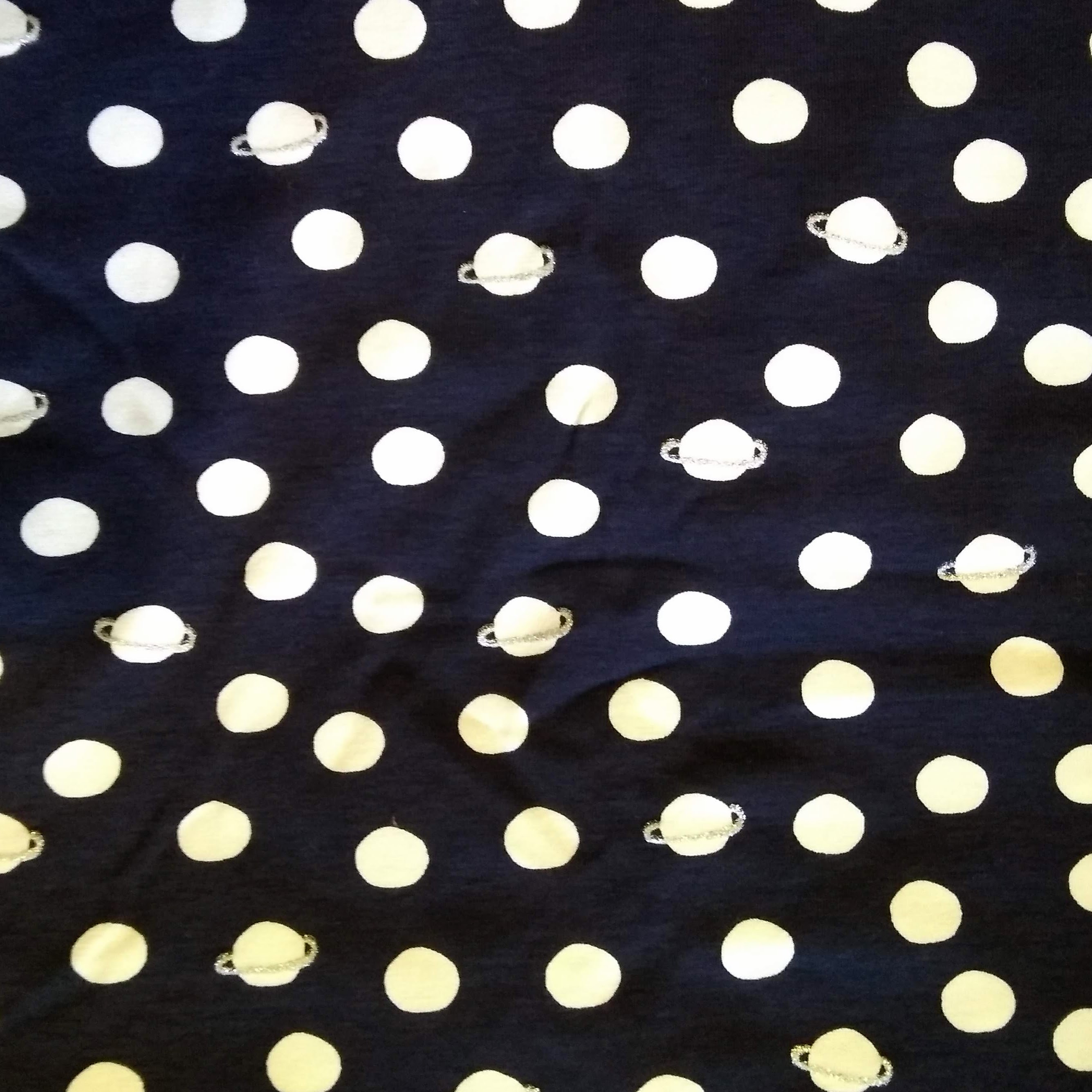 In September I also purchased two stretch fabrics, the first a remnant khaki floral ponte knit which I am in the process of making into a dress, and the second, a cotton spandex with planets on it which I was so excited to buy!