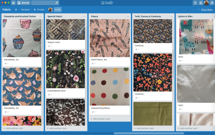 I have started keeping track of my patterns, fabric, haberdashery and plans in Trello after hearing the idea in episode 3 of the Love to Sew podcast. When I heard this idea I thought what a great way to stay organised!