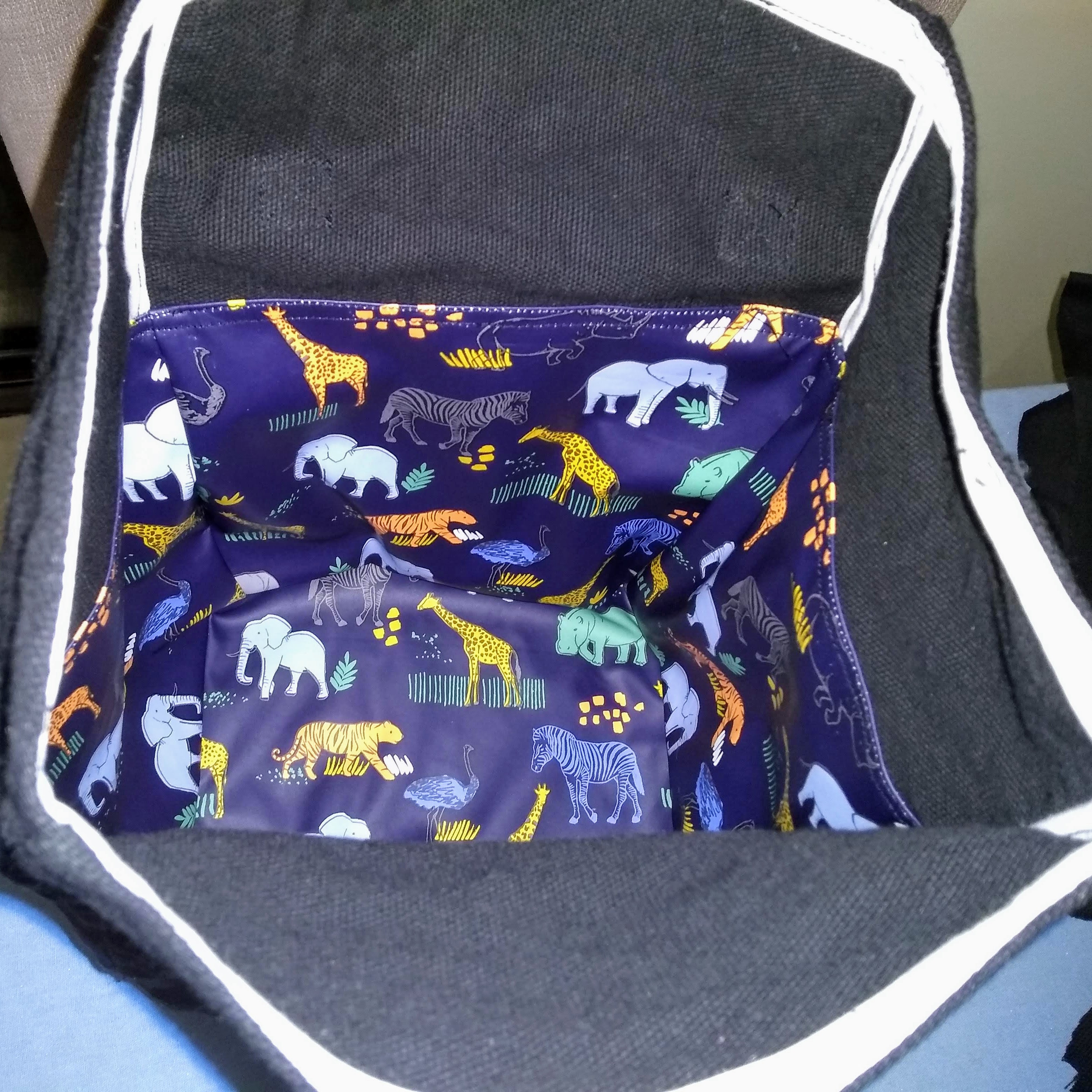 The first item I made was a self-drafted lunch bag made from black canvas and animal raincoat fabric. I based the pattern on my boyfriend’s lunch bag, and I am really happy with how it turned out.
