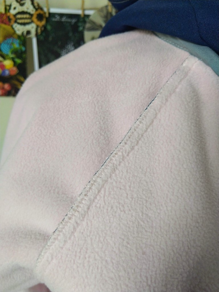 Given that the fabric I chose was a shell fleece, it seemed like a waste to cover up the soft fleecy inside, so I chose to omit the lining and instead finish seams with bias binding and a machine blanket stitch.