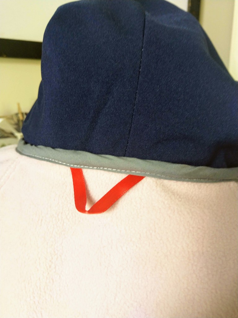 I used a navy panama suiting fabric for the hood lining and the facings which worked very well. Instead of making the hanging loop out of shell fabric or lining fabric, I used red ribbon.